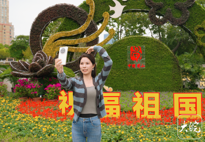 潜山路与休宁路交口的花展将绿色生态理念与科技创新元素相结合,如意造型的绿雕、象征创新的芯片图案,与纷飞的和平鸽、蝴蝶共同勾勒出一幅绿色发展、家国同庆的盛世图景,祈愿人与自然和谐共生。